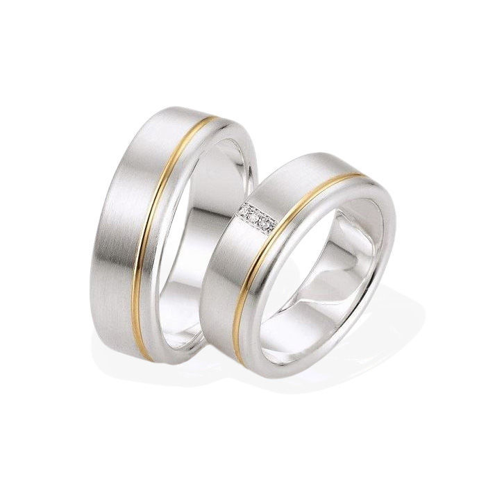 Forlovelsesringer - gifteringer fra Gettmann i sølv 925. Ringene har en bredde på 7 mm, 2 mm tykk. Dame ringen har 3 diamanter - 0,015 ct i god kvalitet.