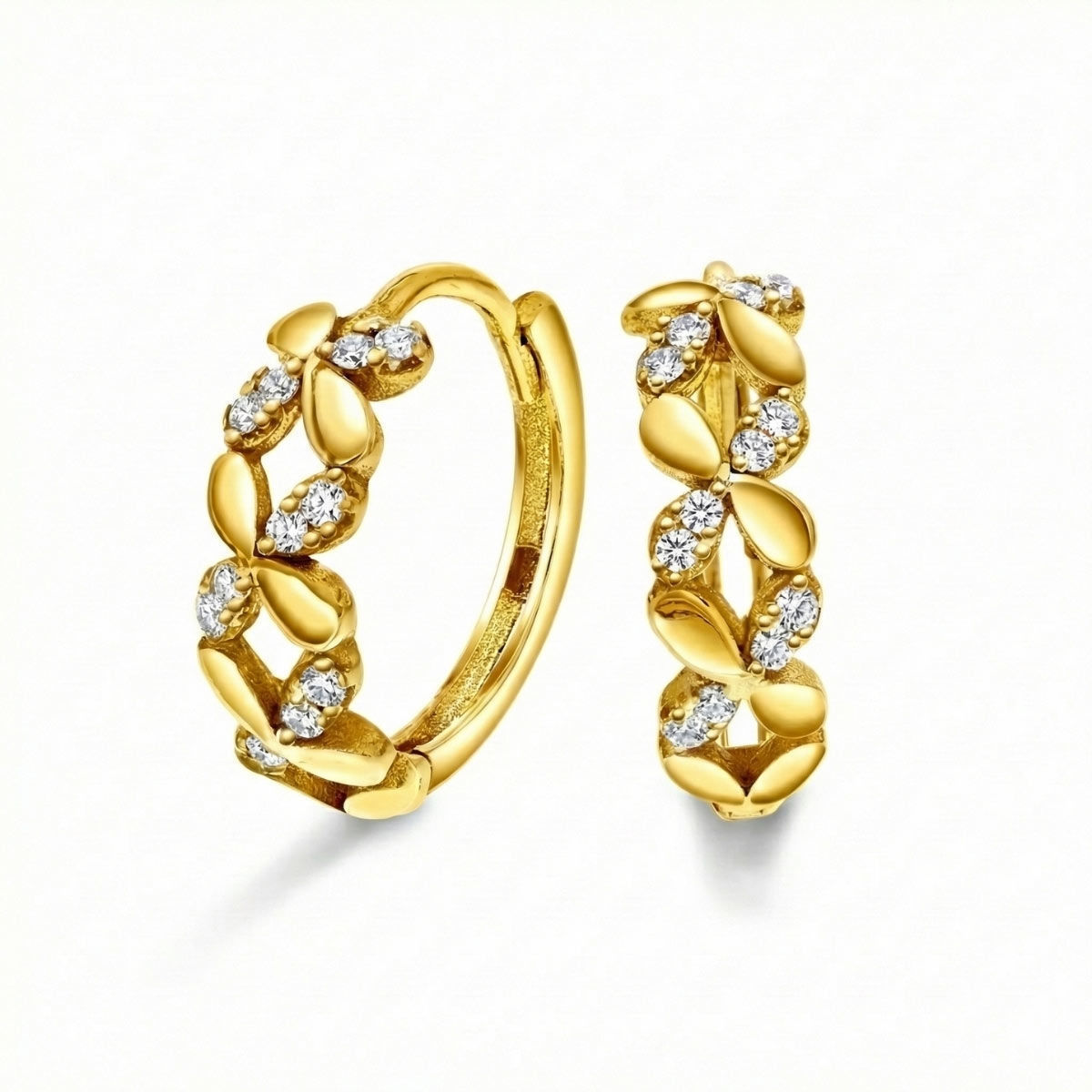 Øredobber Kreol med zirkonia i 14 kt gult gull - elegant, feminin og klassisk. Disse elegante kreoløredobbene i 14 karat (585) gult gull kombinerer klassisk form med glitrende detaljer. Designet er utsmykket med klare zirkonia og bladformede elementer som gir et luksuriøst og feminint uttrykk.