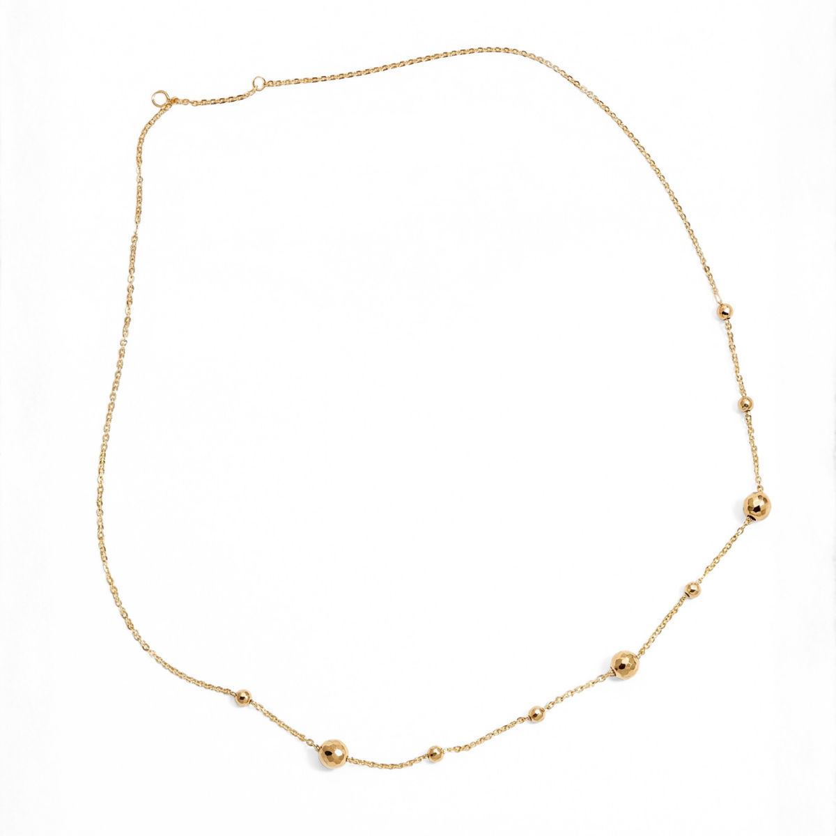 Dette delikate gullsmykket er laget i 18 karat gult gull og har en lengde på 45 cm – perfekt til både hverdagsbruk og festlige anledninger. Den elegante kjeden med små, polerte kuler gir et sofistikert og moderne uttrykk, samtidig som den klassiske utførelsen gjør smykket tidløst. Smykket kan bæres alene for et minimalistisk preg eller kombineres med anheng for å skape et personlig uttrykk. Et luksuriøst valg som passer til enhver stil og anledning.