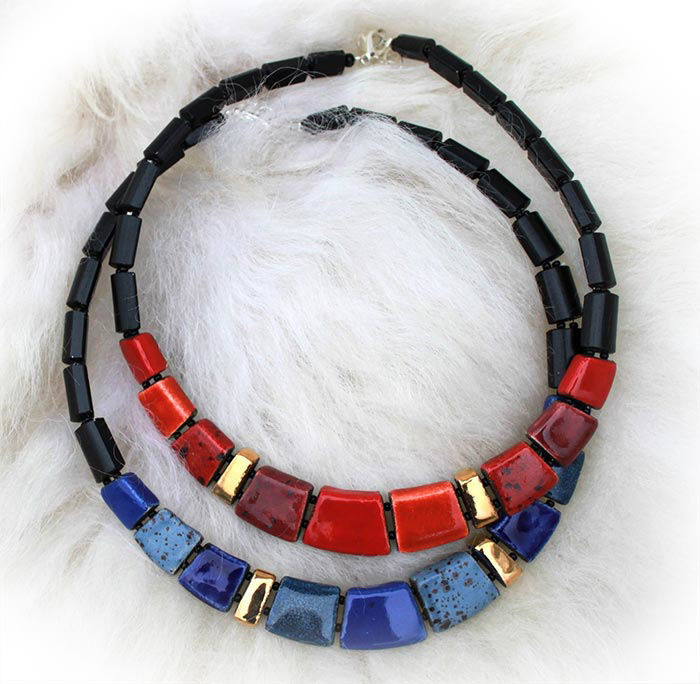 Farget keramikk med ekte forgylt gull. Sort trekjede. Størrelse 1,7 cm x 45 cm. + forlengelse lenke.