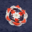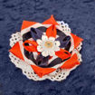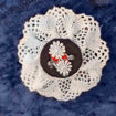 Brosje laget i Norge av høykvalitets materialer, pyntet med zirkonia stein, perler, silkebånd, blonder. Alle materialer kjøpt i Norge.