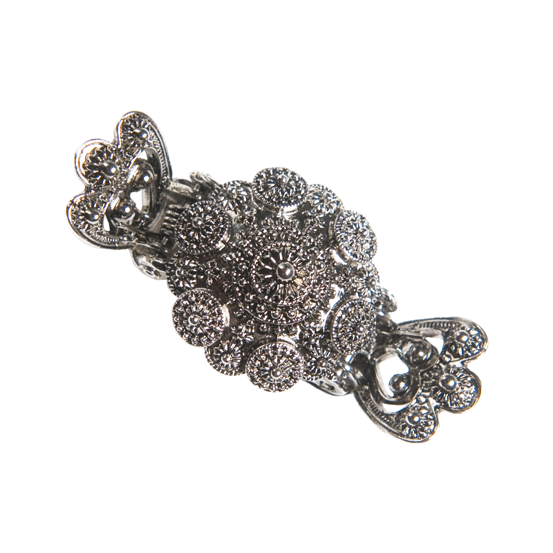 Elegant hårklype i oksidert sølv. Lekkert design som pyntar opp håret på eit blunk og held det på plass. Praktfull gåve til store og små jenter. Finst også i ein mindre storleik.