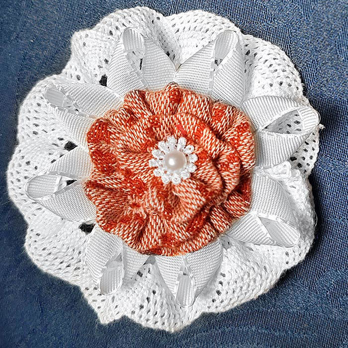 Håndlaget hårpynt, hårspenne til bunad & fest, diameter 7 cm. Hårspenne laget av original stoff til bunad.