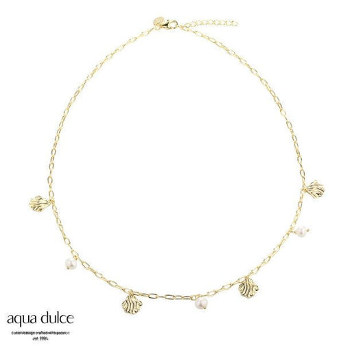 • 42 cm. kæde i forgyldt sterling sølv med bølgende vedhæng og hvide 5 mm. ferskvandsperler.
