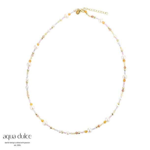 Halskæde med pastelfarvet perler, ferskvandsperler & 925 forgyldt sterling sølv kugler. Længde: 43 + 4 cm.