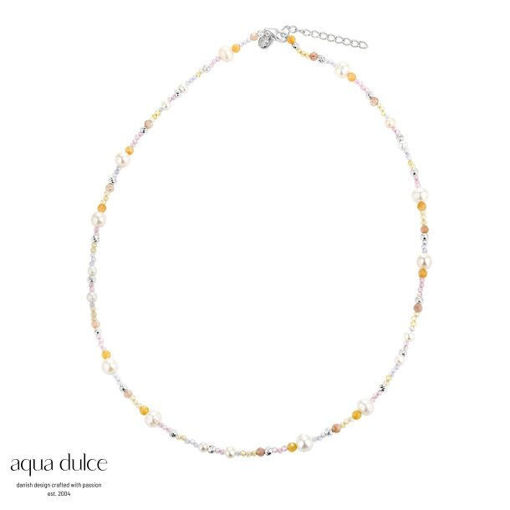 Halskæde med pastelfarvet perler, ferskvandsperler & sterling sølv kugler. Længde: 43 + 4 cm.