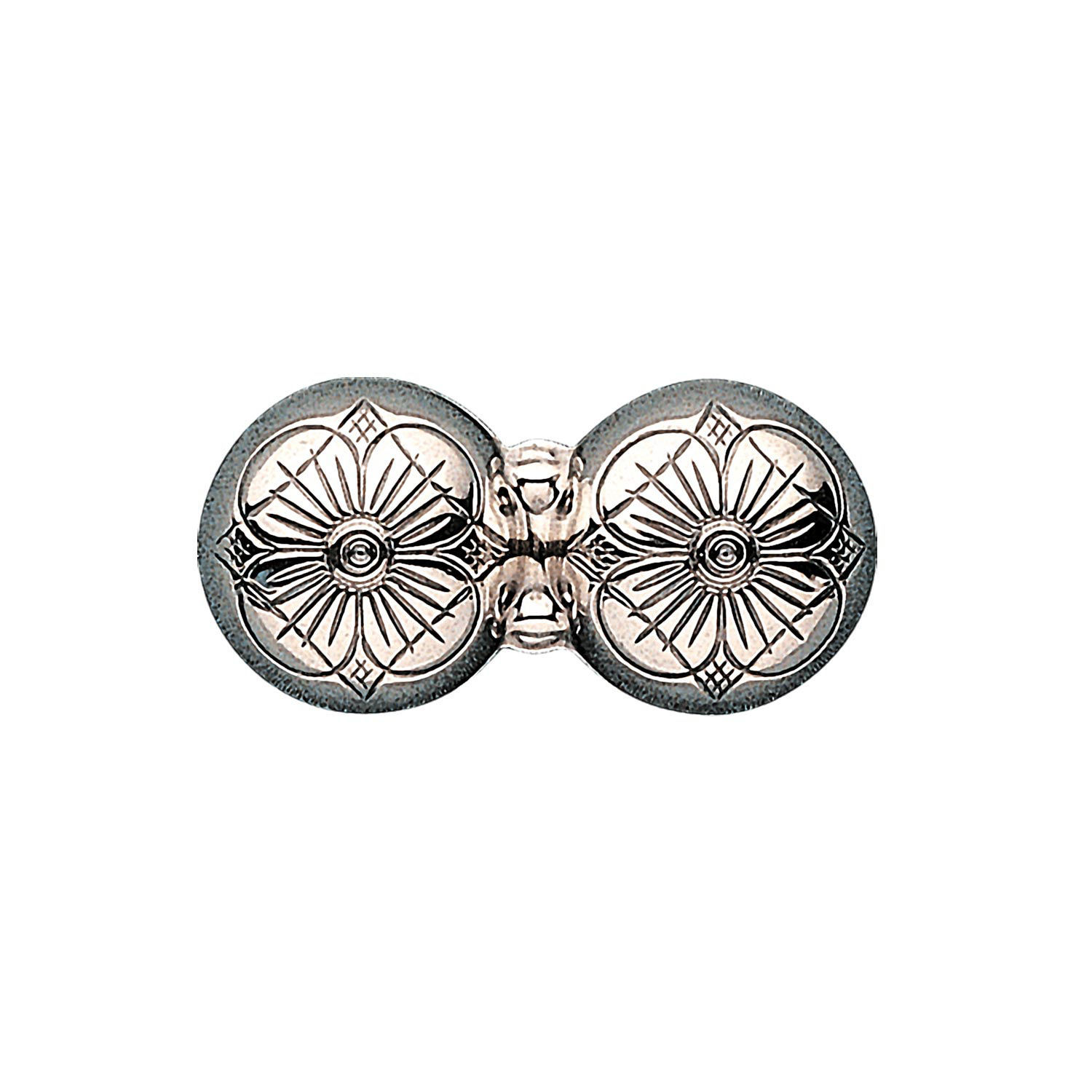 Dobbel halsknapp i oksidert sølv med tradisjonell firkløvermotiv for hell og lykke.