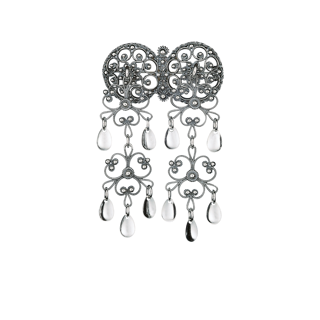 Oksidert halssølje med utsøkt filigrandekor. Utsmykka med dobbelt heng og blenkjande drypplauv.