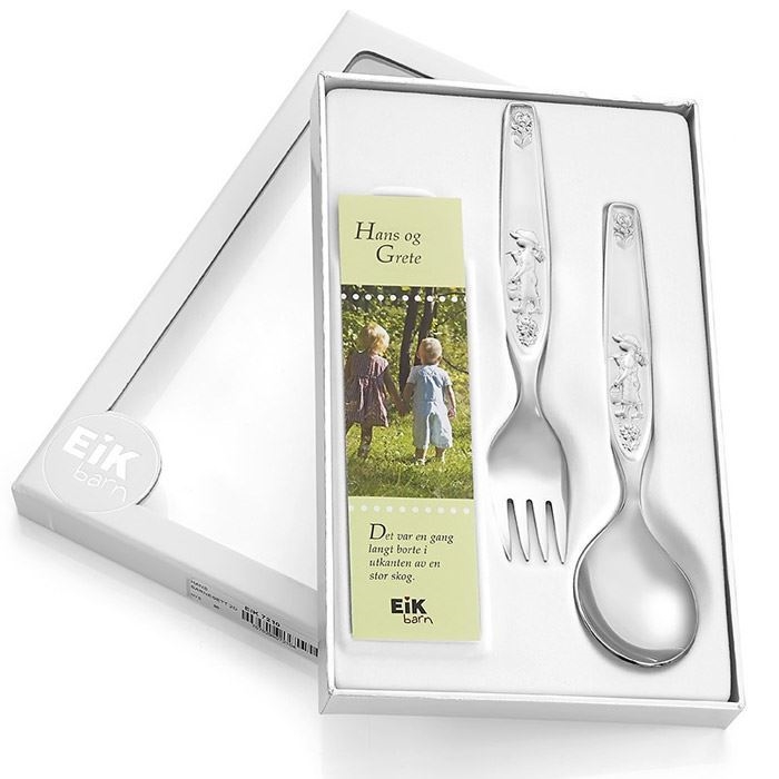 Hans og Grete barnebestikk fra Eik Barn er laget i 925 sølv og finnes med motiv både for gutt og jente. Dette tidløse bestikket består av skje, gaffel og kniv, og kan graveres med navn og dato for å gjøre det til en personlig gave. Perfekt til dåp eller andre spesielle anledninger!