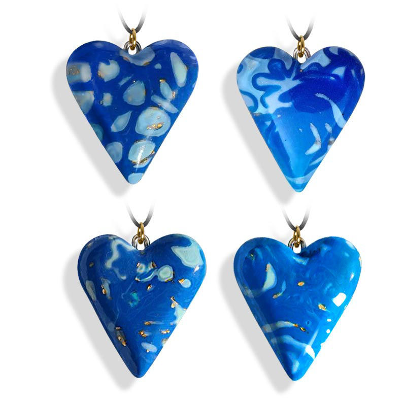 4 varianter, velg variant. Norsk design og produksjon. Blå mønster er på en side. Smykke har størrelse ca 2,5x2,3 cm, tykkelse 3 mm, håndlaget. Snor med lås ikke inkludert i prisen. Velg snor eller sølv kjede. Overflaten er blank, polert og lakkert. Alle smykker er unike, finnes kun 1 stk av hver. Se i beskrivelsen nede hvordan smykke ble laget.