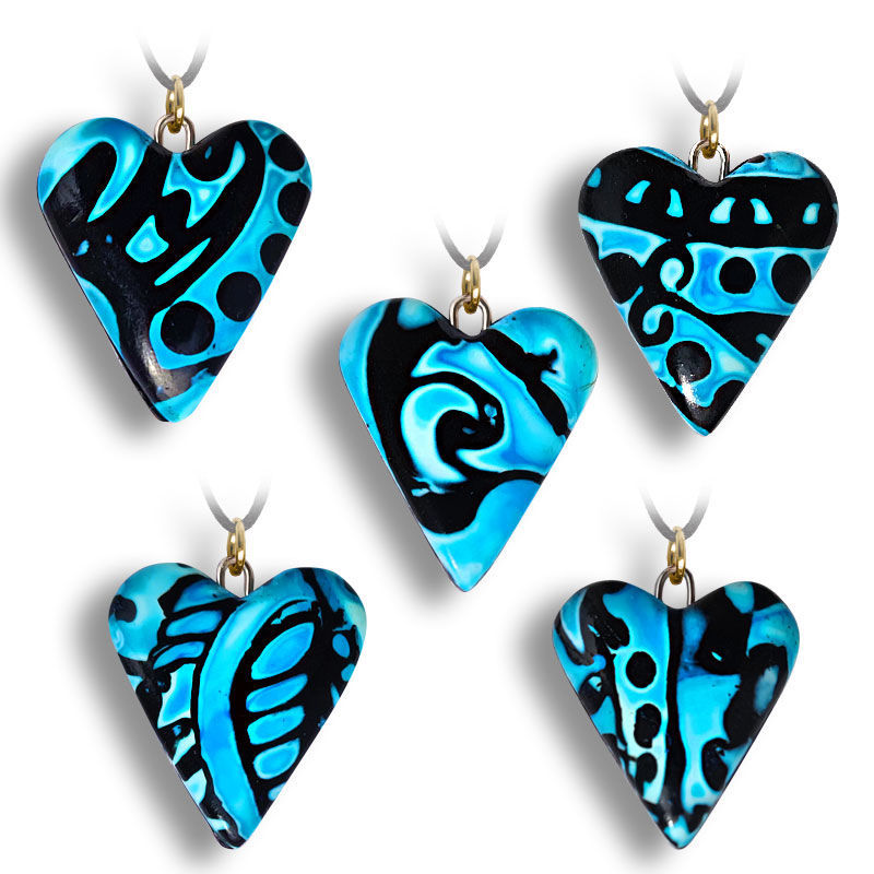 5 varianter, velg variant. Norsk design og produksjon. Blå & sort mønster er på en side. Smykke har størrelse ca 2,5x2,3 cm, tykkelse 3 mm, håndlaget.Snor med lås ikke inkludert i prisen. Velg snor eller sølv kjede. Overflaten er blank, polert og lakkert. Alle smykker er unike, finnes kun 1 stk av hver. Se i beskrivelsen nede hvordan smykke ble laget.