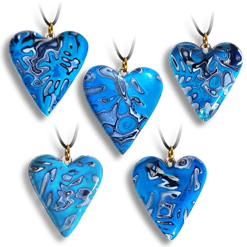 5 varianter, velg variant. Norsk design og produksjon. Blå & sort mønster er på en side. Smykke har størrelse ca 2,5x2,3 cm, tykkelse 3 mm, håndlaget. Snor med lås ikke inkludert i prisen. Velg lengde på snor eller sølv kjede. Overflaten er blank, polert og lakkert. Alle smykker er unike, finnes kun 1 stk av hver. Se i beskrivelsen nede hvordan smykke ble laget.