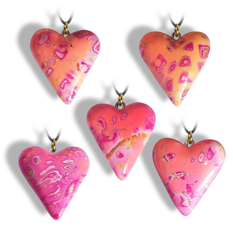 6 varianter, velg variant. Norsk design og produksjon. Rosa-oransje mønster er på en side. Smykke har størrelse ca 2,5x2,3 cm, tykkelse 3 mm, håndlaget. Snor med lås ikke inkludert i prisen. Velg snor eller sølv kjede. Overflaten er blank, polert og lakkert. Alle smykker er unike, finnes kun 1 stk av hver. Se i beskrivelsen nede hvordan smykke ble laget.