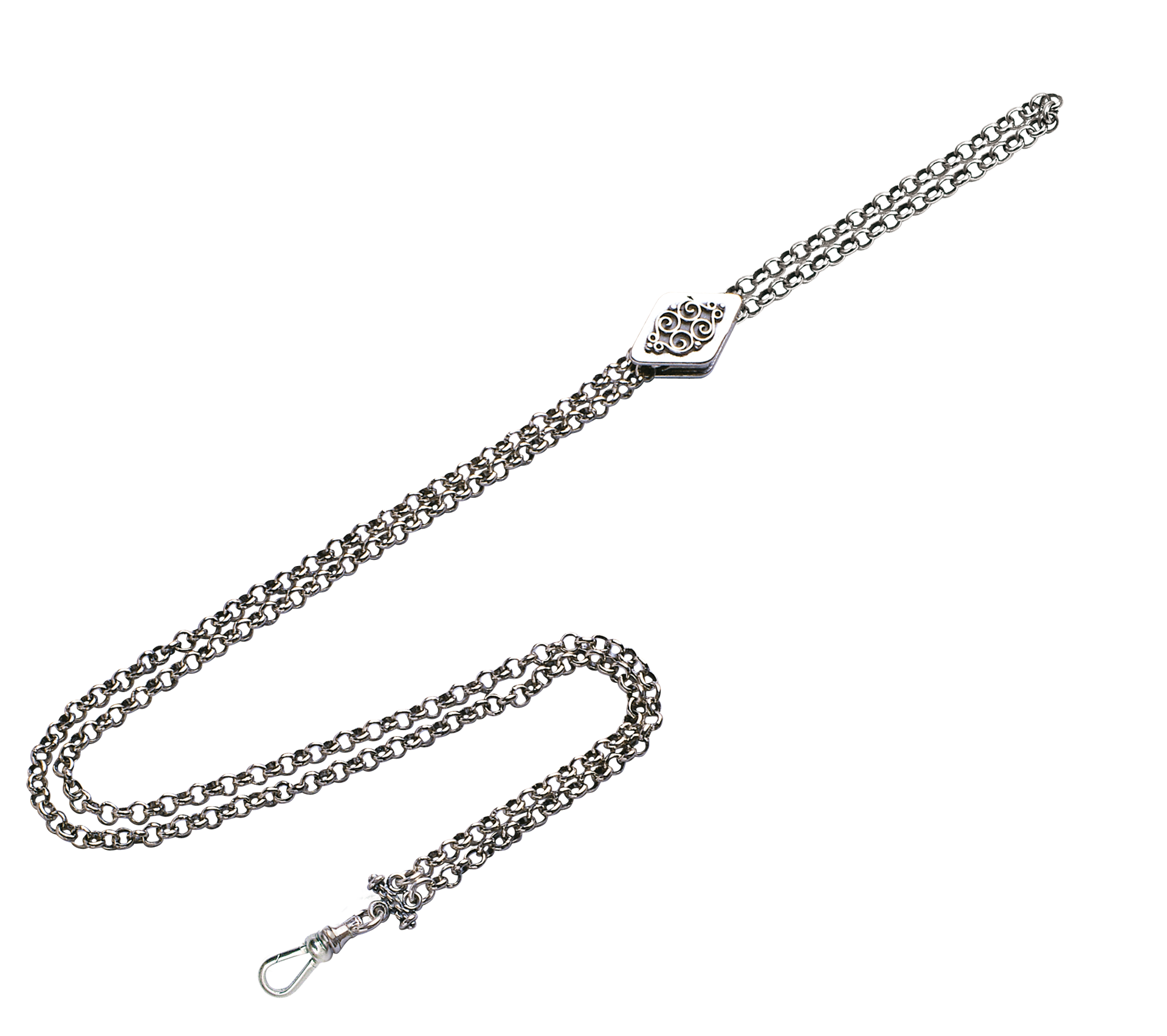 Klokkekjede i oksidert sølv.. Den er 50 cm lang og består av to rader. Du festar klokka med karabinkroken og har kjeda rundt halsen som eit smykke.