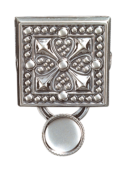 Knivstøl i oksidert sølv. Kniven festar du ved å tre slira innpå trådkantlauvet som fungerer som knapp. Motivet med diagonalkrosset finn ein att i mykje av bunadsølvet rundt om i landet, og denne typen beltestølar har gjennom generasjonar vore den mest brukte. Du monterer dei på skinnlist eller stoffbelte med monteringsringane bakpå.