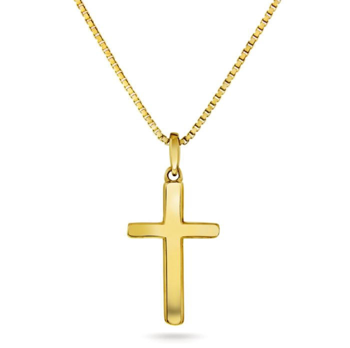 Pent, enkelt forgylt sølvkors, kjede medfølger. 42 + 3cm lengde på kjede