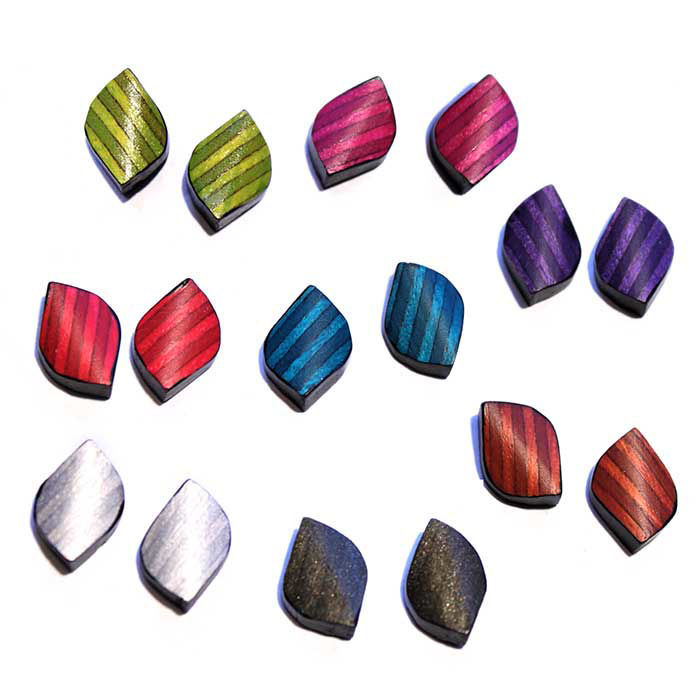 Ørepynt i farget tre. Stikk i kirurgisk stål. Størrelse 0,9 cm x 1 cm.