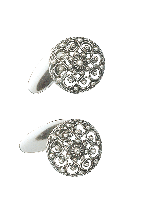 Vakre mansjettknappar som vert brukt på skjortene til bunader i Opplandsområda. Dei er i oksidert sølv med kruse flott filigrandekor.