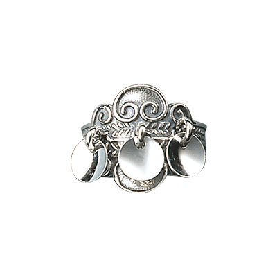 Bunadsring i oksidert sølv med tre, blenkjande lauvheng og tradisjonsrik filigrandekor. Ringen er regulerbar i storleiken 54-56. Passar til bunader med oksidert bunadsølv.
