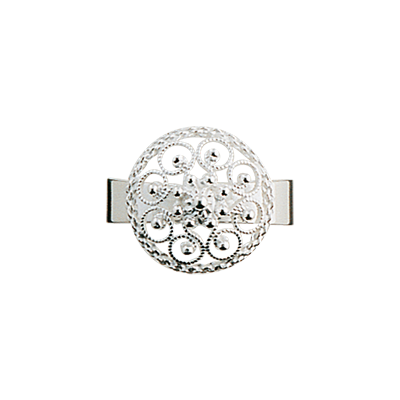 Dekorativ bunadsring i kvitt sølv med detaljert filigransarbeid. Ringen er regulerbar og passar alle storleik.