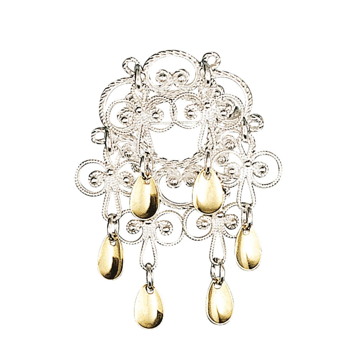 Denne hvitforgylte søljen til barn er et vakkert og tidløst bunadssmykke, laget med intrikat filigransarbeid og små forgylte heng som gir et elegant og festlig uttrykk. Søljen er spesielt tilpasset barnebunad og festdrakt, og kombinerer tradisjonelt norsk håndverk med en lett og harmonisk design. Den kvitforgylte finishen gir glans og varme, og gjør søljen til et perfekt tilbehør ved høytidelige anledninger som konfirmasjon, bryllup, dåp og 17. mai.
