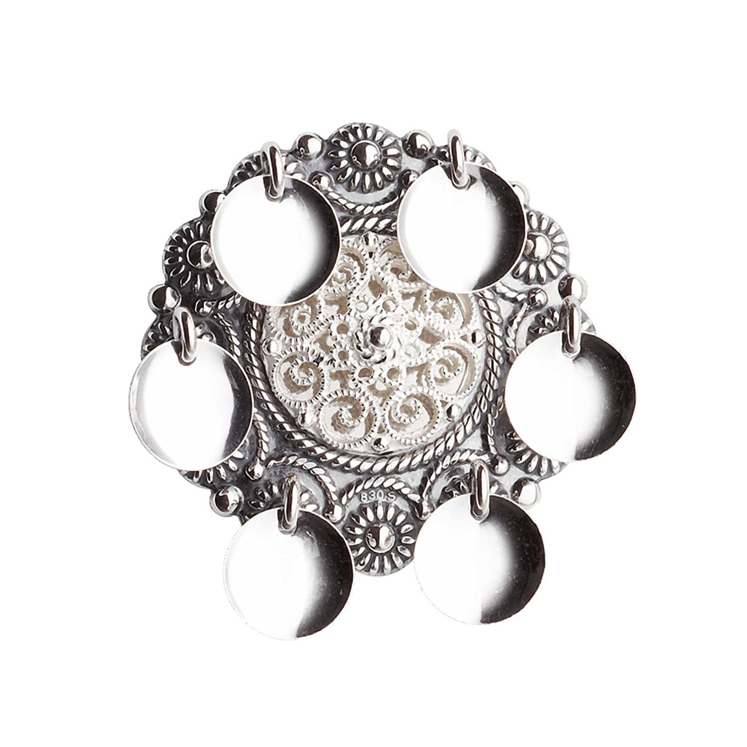 Denne vakre barnesøljen i hvitt sølv er et tradisjonelt smykke med dype røtter i norsk kulturarv. Søljen er utsmykket med intrikat filigransarbeid og dekorative detaljer som gir et tidløst og klassisk uttrykk. De blanke hengene reflekterer lyset og skaper liv og bevegelse, samtidig som de fremhever søljens håndverksmessige kvalitet.