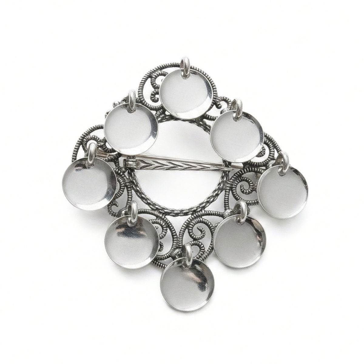 Denne vakre barnesøljen i hvitt sølv er et tidløst smykke med dype røtter i norsk kulturarv. Søljen er utsmykket med intrikat filigransarbeid og dekorative detaljer som gir et klassisk og tradisjonelt uttrykk. De blanke hengene reflekterer lyset og skaper liv og bevegelse, samtidig som de fremhever søljens håndverksmessige kvalitet.