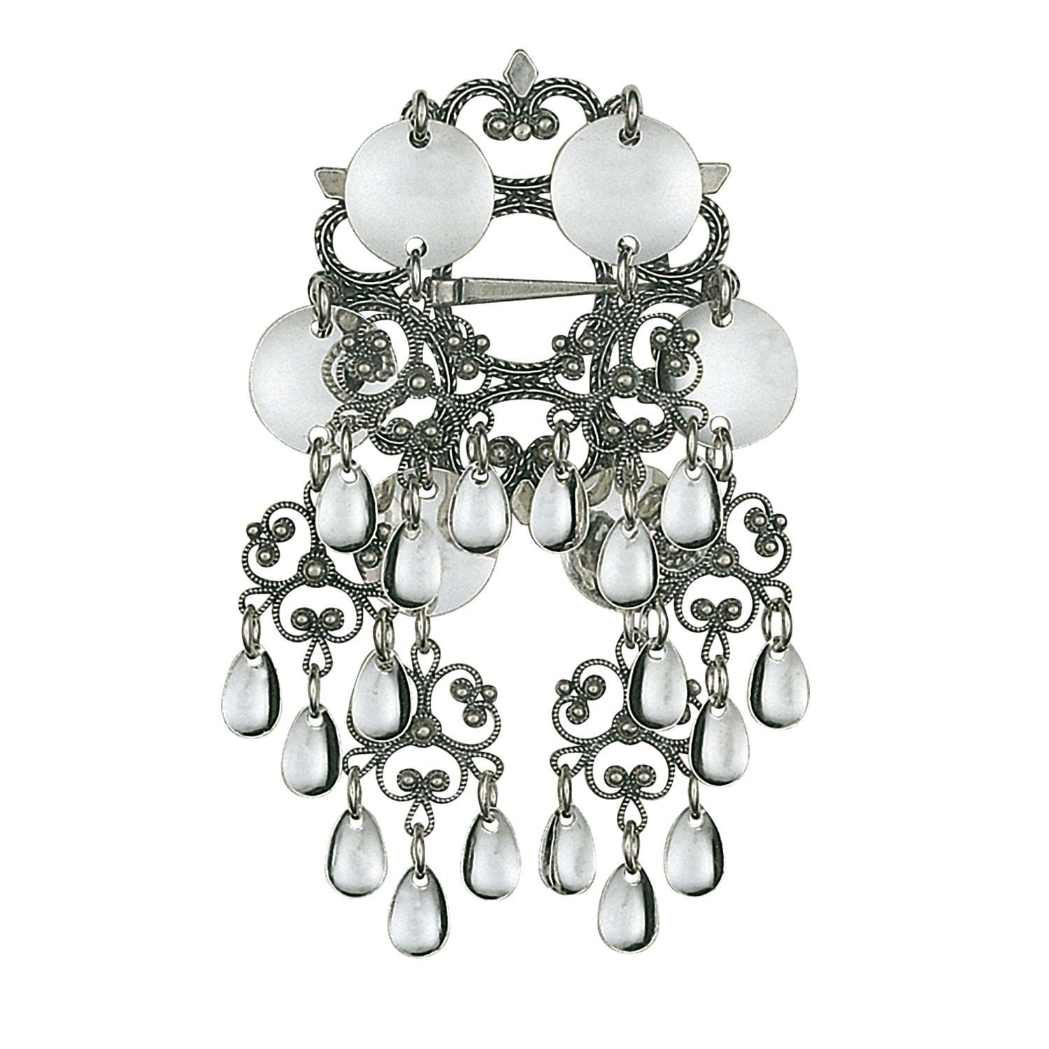 Denne tradisjonelle barnesøljen i hvitt sølv er et tidløst smykke med røtter i norsk kulturarv. Søljen er utsmykket med intrikate filigransdetaljer og heng som reflekterer lyset og gir liv til smykket. Den blankpolerte overflaten fremhever håndverket og gir et klassisk uttrykk som passer perfekt til bunad og festdrakt.