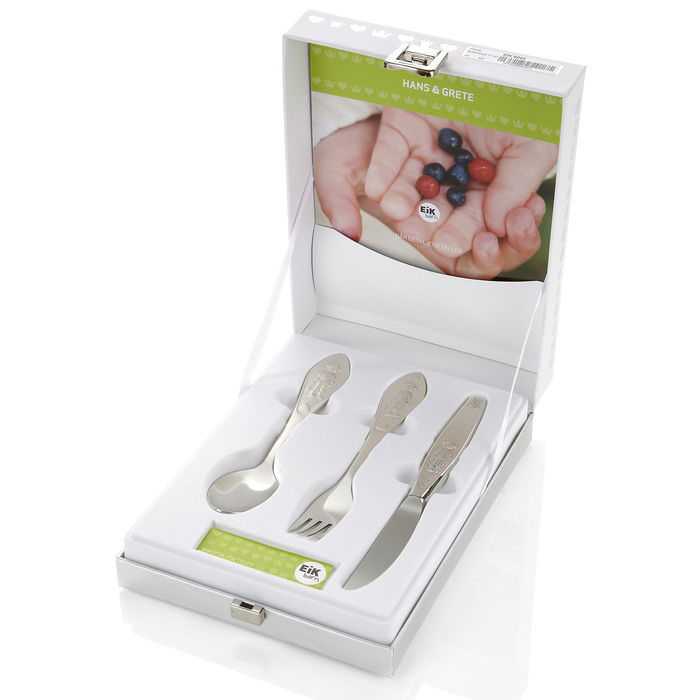 Barnesettet (kniv/skje/gaffel) er en del av serien Hans og Grete. I denne serien finnes det mange produkter, blant annet sølvbestikk (babyskje, kniv, skje, gaffel) krus og tallerken i sølv, porselen, smykkeskrin, fotorammer og album. Serien er designet av vår designer Oddny H. Møyland. Barnesettet (kniv/skje/gaffel) er produsert i Norge, i EIKs lokaler utenfor Tønsberg, og leveres som standard med skarpslipt kniv. Alle våre produkter leveres i flotte gaveesker. Barnesettet (kniv/skje/gaffel) er produsert i ekte sølv, i kvalitet 925. Størrelse: Lengde kniv / skje / gaffel: 16,5 / 14,5 / 14,5 cm.