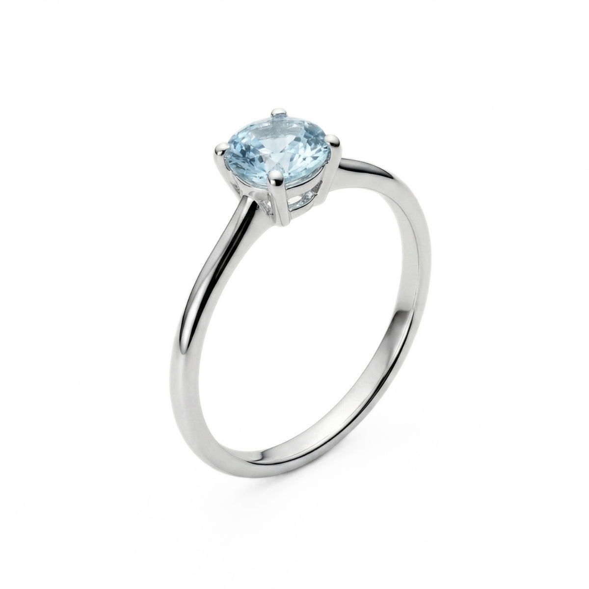 Oppdag en tidløs ring i hvitt gull med rundslipt blå topas, festet med fire elegante klør som fremhever steinens glans og klarhet. Den minimalistiske designen gir et moderne uttrykk og gjør ringen perfekt som forlovelsesring, gave til jubileum eller som et stilrent smykke til hverdagsbruk.