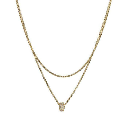 Nätt halsband i Guldpläterat stål av 2 olika kedjor i längderna 45, 50 cm. Hänge i form av en ring fylld med 28 st infattade klara kristaller.