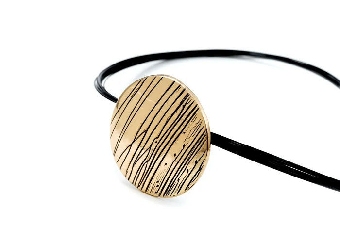 “Gry”, lite bronsesmykke. Gry” i bronse designet av Anna Berthelsen. Anhenget har en diameter på 35 mm med en 6 – strengs wire på 45 cm.