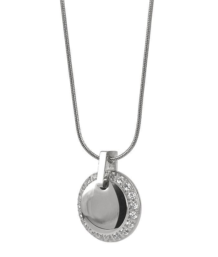 CORINNE Short Necklace Steel. Short necklace in polished steel plated steel with a plate lined with small clear crystals. Steel chain. Size of pendant: diameter 14 mm . Color: Polished Steel / Transparent crystals. Material: Steel. Length: 40 cm + 6 cm extension chain.