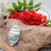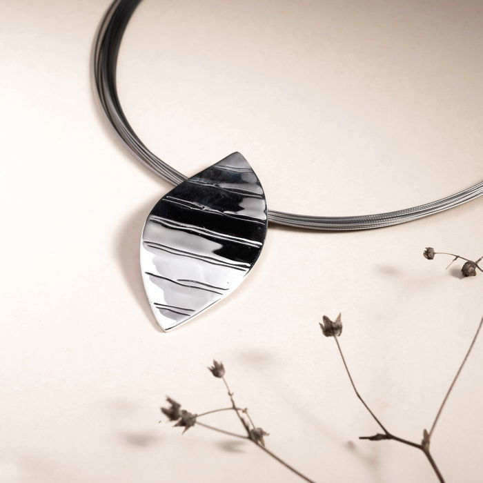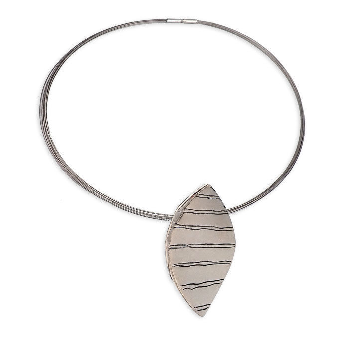 «Bladverk» i sølv designet av Anna Berthelsen. Serien er en del av en kolleksjon som tar utgangspunkt i former som har blitt skapt og slipt av naturen over lang tid. Anhenget har en diameter på 50 x 25 mm med en 20 – strengs wire på 45 cm. "Bladverk", lite sølvsmykke antall