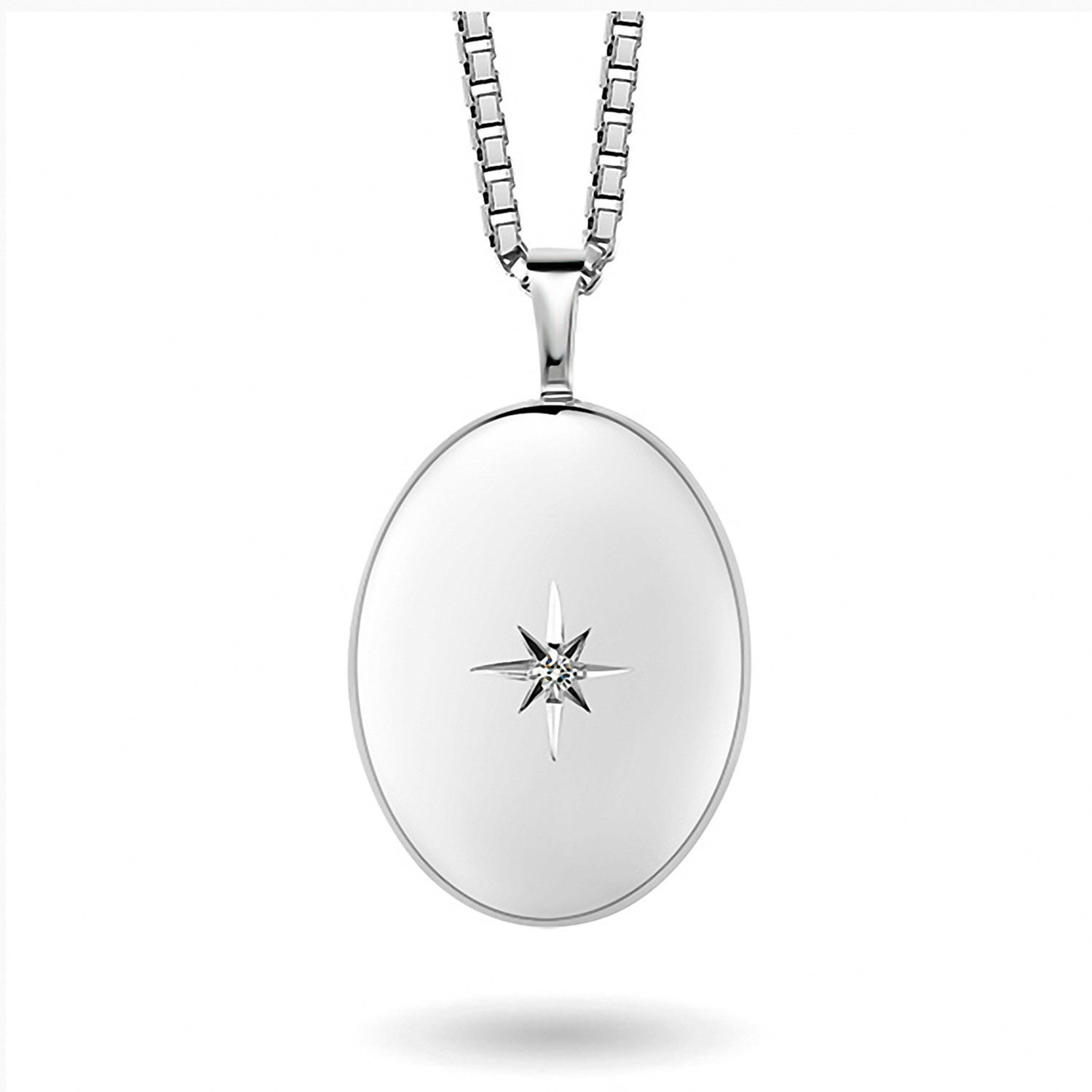 Oval medaljong i sølv 925 med 0,01 ct. W/P1 diamant. Plass til 2 bilder. Bredde: 15 mm., høyde: 20 mm. Sølvkjede på 37 cm medfølger. Både anhenget og kjedet er rhodinert.