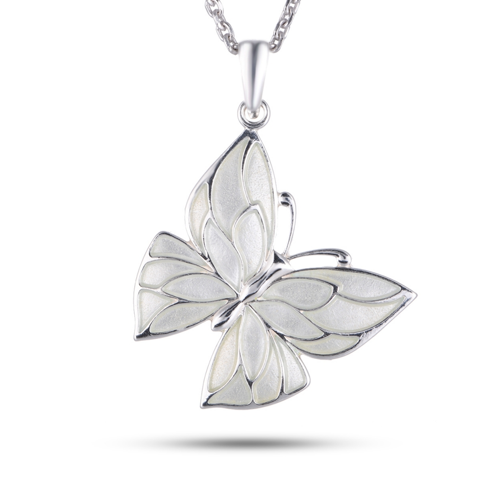 Sommerfugl anheng i hvit glassemalje. Høyde 25 mm. Ankerkjede 42+5 cm medfølger.. Smykkene er i sølv 925.