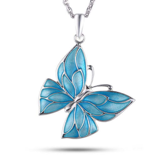 Sommerfugl anheng i turkis glassemalje. Høyde 25 mm. Ankerkjede 42+5 cm medfølger. Smykkene er i sølv 925.