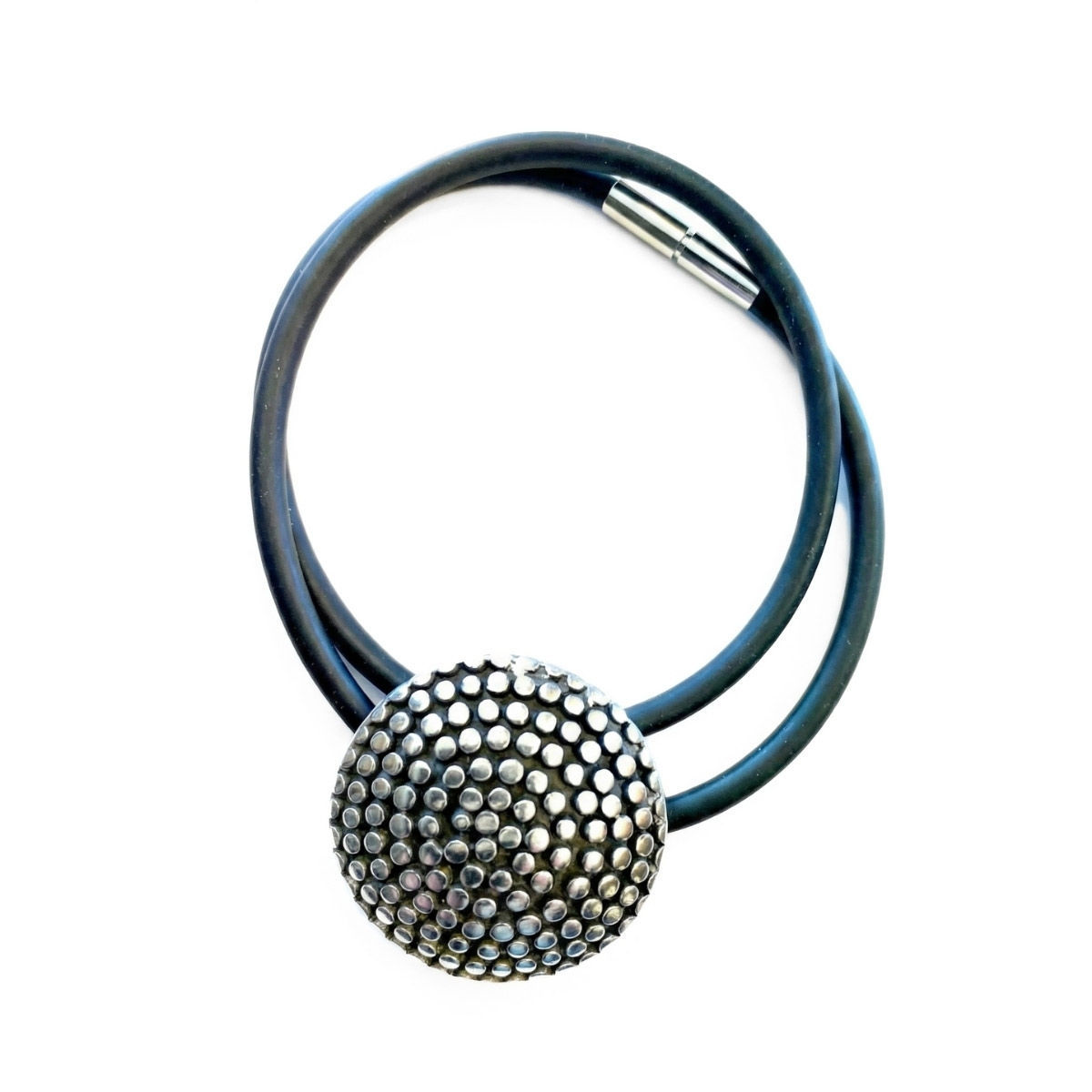 Smykket Slow fra Hillestad er et kunstnerisk og tidløst smykke i tinn, inspirert av naturens rytme og ro. Anhenget har en organisk og strukturert utforming som gir et moderne, men samtidig klassisk uttrykk. Den unike teksturen fremhever smykkets særpreg og gjør det til et elegant blikkfang. Perfekt både til hverdagsbruk og festlige anledninger, og et smykke som kombinerer nordisk minimalisme med kunstnerisk design. Anhenget har en diameter på 38 mm og en gummisnor på 45 cm.