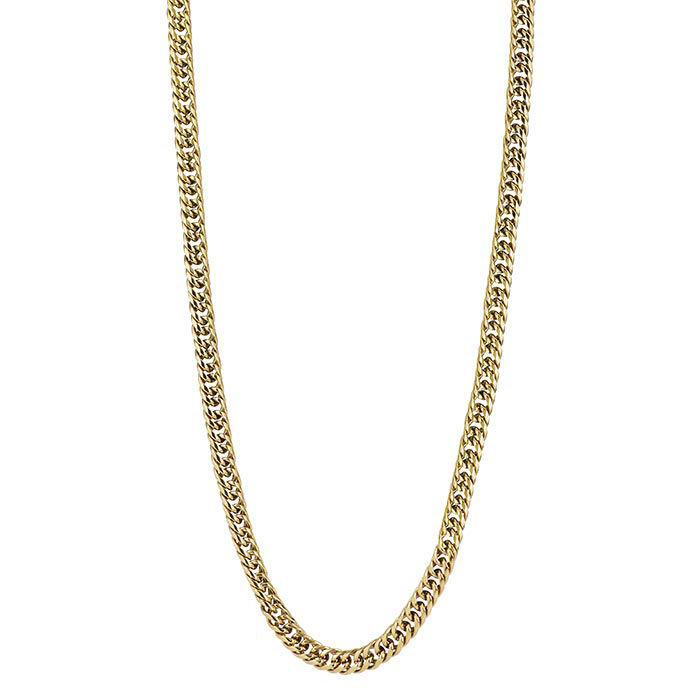 Långt halsband i guldpläterat stål av en platt, tät pansarlänk, med något rundade kanter.