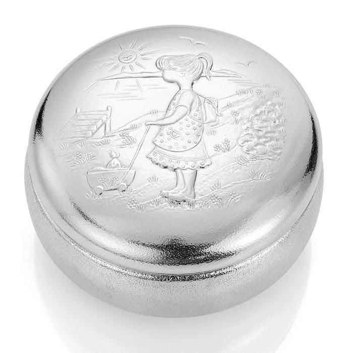 Smykkeskrin i ekte tinn med motiv av Grete fra eventyret om Hans og Grete. Skrinet kan graveres med navn og dato. ​Diameter:11 cm. Hvis du bestiller med graverings tekst da tar det 1 uke ekstra å få levert til deg.