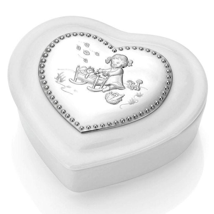 Smykkeskrinet er en del av serien Hjertevenn. I denne serien finnes det mange produkter, blant annet stålbestikk, fotoalbum, skrin, sølvkrus og porselenservise. Serien er designet av vår designer Anita K. Plyhn. Alle våre produkter leveres i flotte gaveesker. Størrelse: Bredde / høyde: 10 / 4 cm.