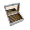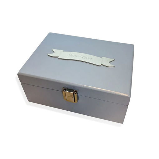 Lys blå lakekrt smykkeskrin i tre (MDF) med banner i ekte tinn. Med grått innlegg og stort speil i lokket. Banneret er produsert i ekte tinn, i EIKs lokaler i Tønsberg. Den kan graveres med navn og dato. Selve skrinet er produsert for EIK i Asia. Leveres i gaveeske.