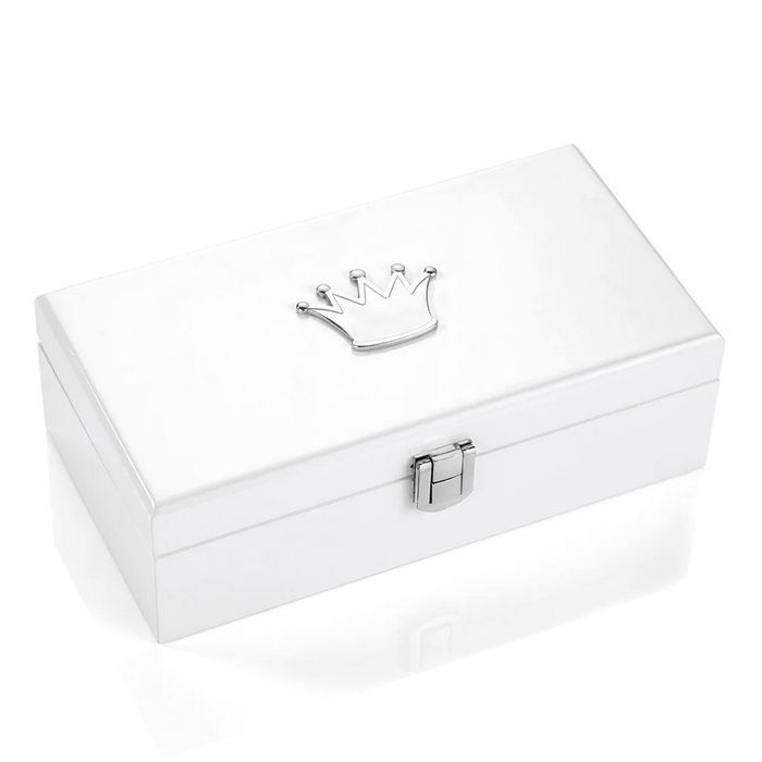Hvitlakkert smykkeskrin i tre (MDF) med krone i ekte tinn. Med grått innlegg og stort speil i lokket. Kronen er produsert i ekte tinn, i EIKs lokaler i Tønsberg. Den kan graveres med navn og dato. Selve skrinet er produsert for EIK i Asia. Leveres i gaveeske.