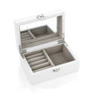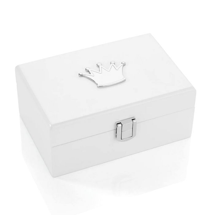 Hvitlakkert smykkeskrin i tre (MDF) med krone i ekte tinn. Med grått innlegg og stort speil i lokket. Kronen er produsert i ekte tinn, i EIKs lokaler i Tønsberg. Den kan graveres med navn og dato. Selve skrinet er produsert for EIK i Asia. Leveres i gaveeske.