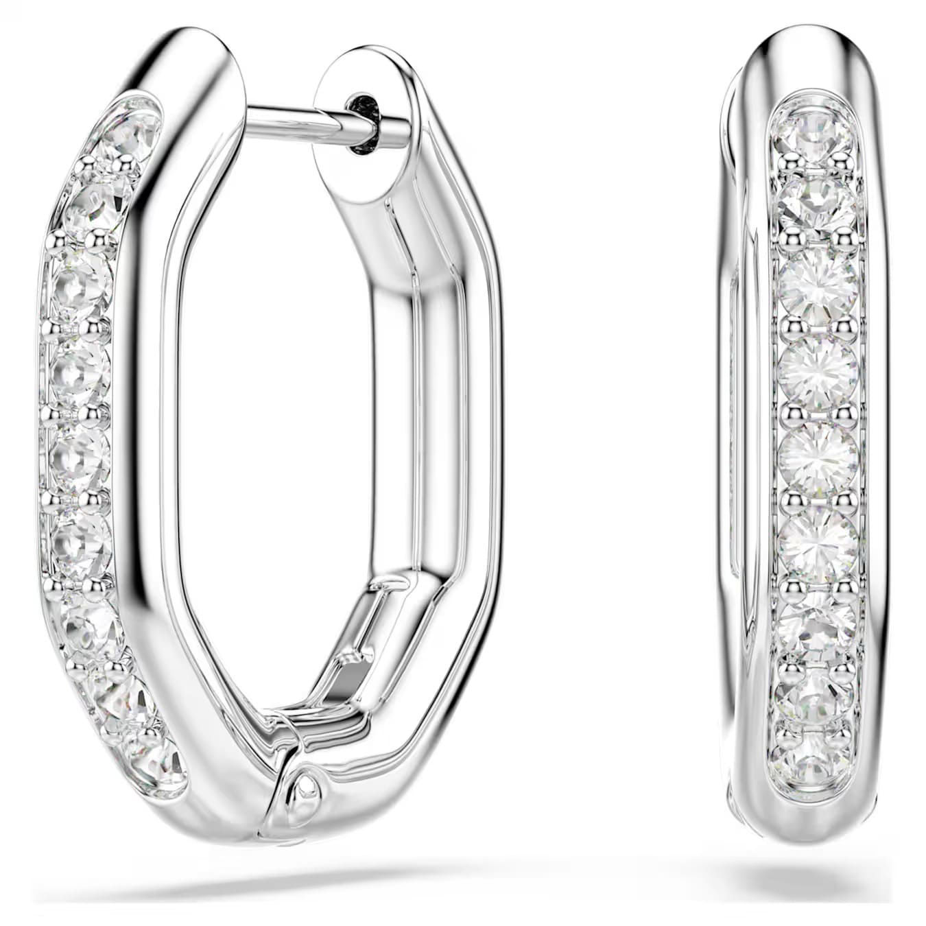 Make an expressive statement with these geometric hoop earrings. Their slender octagonal design creates a bold frame for the single row of clear round-cut crystals, which are each placed in a delicate prong setting. A special spring plate mechanism makes these earrings easy to open and close, while the rhodium plating is ready to mix and match with other Dextera pieces.