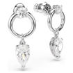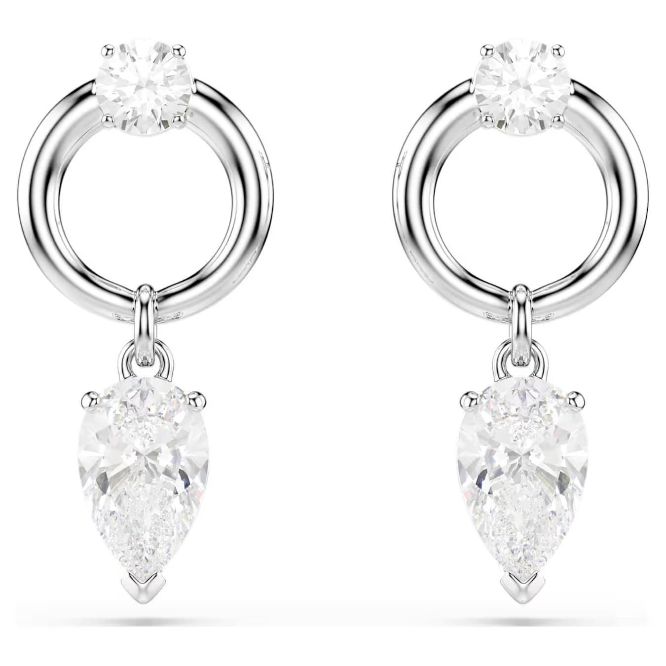 Catch the light from all angles with these unique Mesmera earrings. Each shimmering motif features a pear-cut Swarovski Zirconia, which is attached to a luxurious rhodium plated hoop. An additional round-cut Swarovski Zirconia is also placed at the center. Wear them alongside the matching pendant to create your own stunning set.