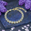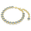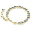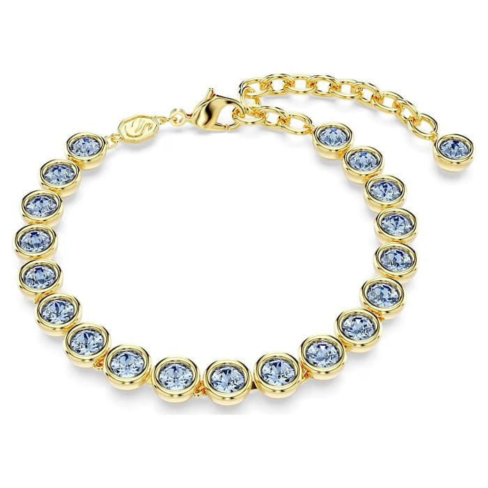 Elevating any outfit, this Imber bracelet will surround your wrist with luminous joy. The gold-tone plated design features a complete strand of round blue crystals in a puffy bezel setting and is completed with a lobster closure. Pair it with a matching necklace to enhance your casual styling.