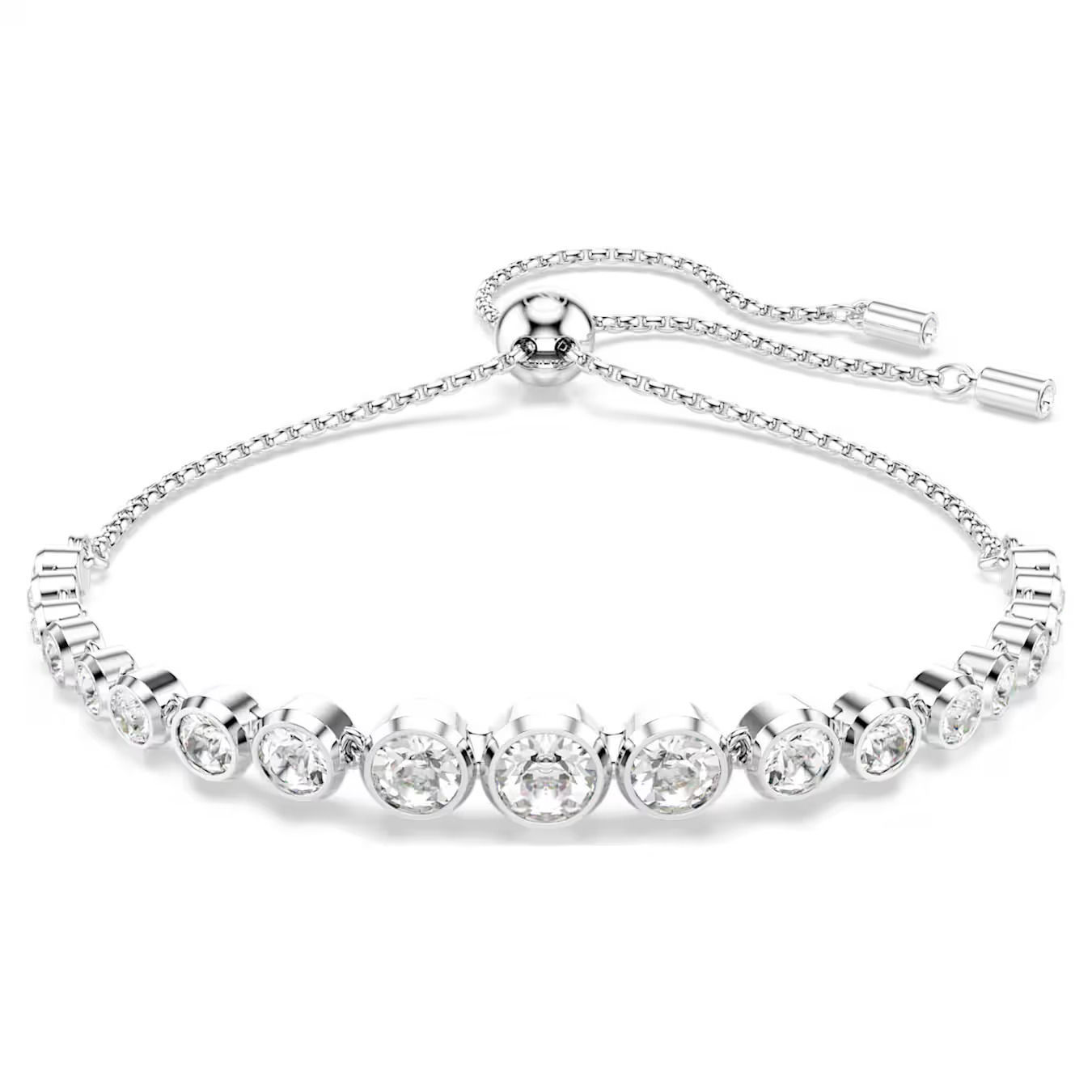 Made for everyday elegance, this rhodium plated bracelet exudes the simplicity of the Imber family. The design features a gradient of clear round-cut crystals, each placed in a modern bezel setting on a soft chain, with a sliding closure for easy wearability. Each delicate drop provides glowing sophistication for your wrist, giving you a go-to piece of jewelry that can