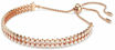 This timeless rose gold-tone plated bracelet is an ideal gift for lovers of light. Two delicate strands of Swarovski Zirconia are set in an elegant cupchain design, draping beautifully around the wrist. The jewelry is then finished with an innovative sliding ball closure, allowing you to adjust the size for the perfect fit. Wear this bracelet for daytime sophistication or dial up the evening glamour by layering it with contrasting styles.