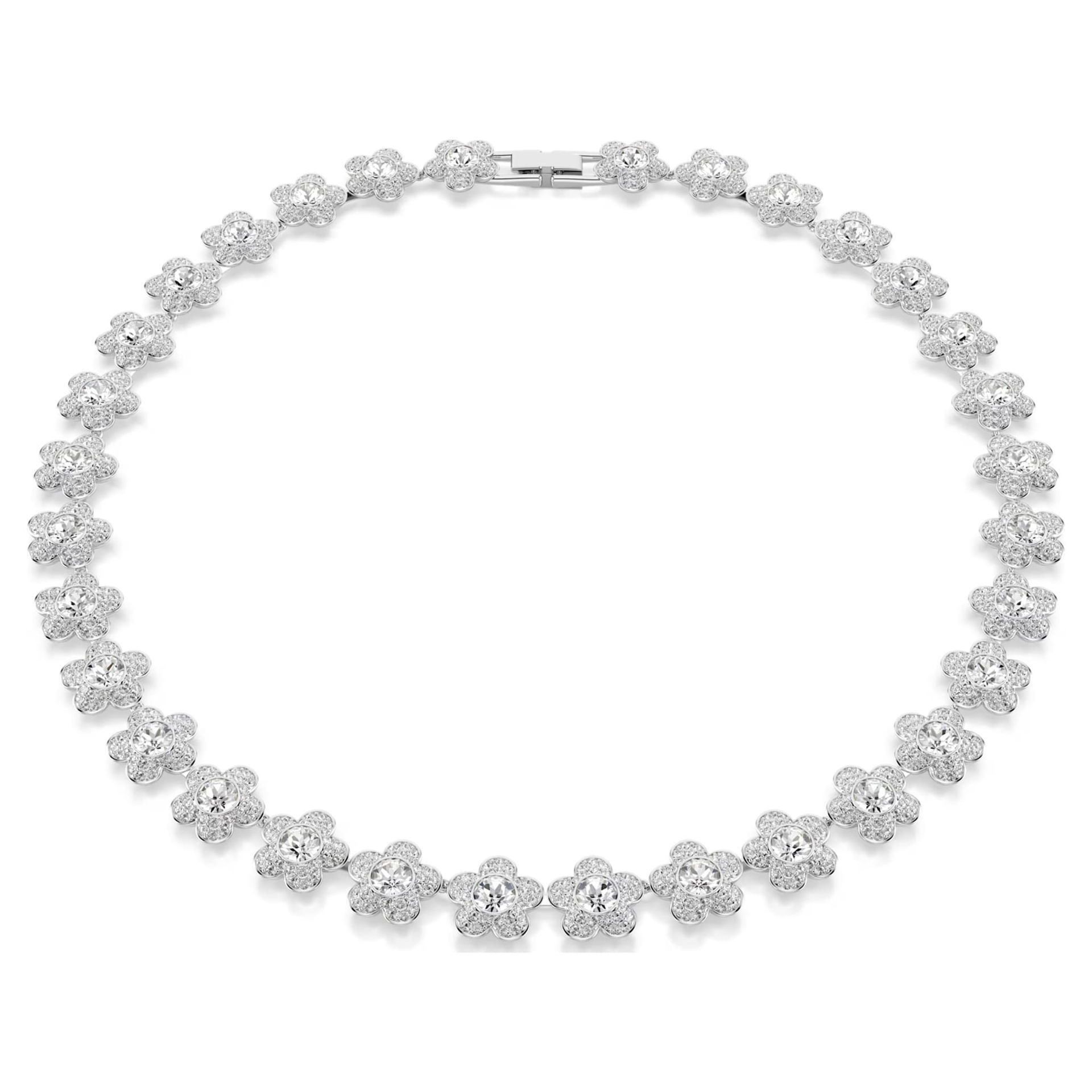 A necklace that evokes the beauty of nature, this rhodium plated design features an all-around strand of delicate flowers, each made with a crystal center and petals adorned in glittering pavé. Like a radiant daisy chain, this light-reflecting necklace can be worn with the matching bracelet for a timeless combination.